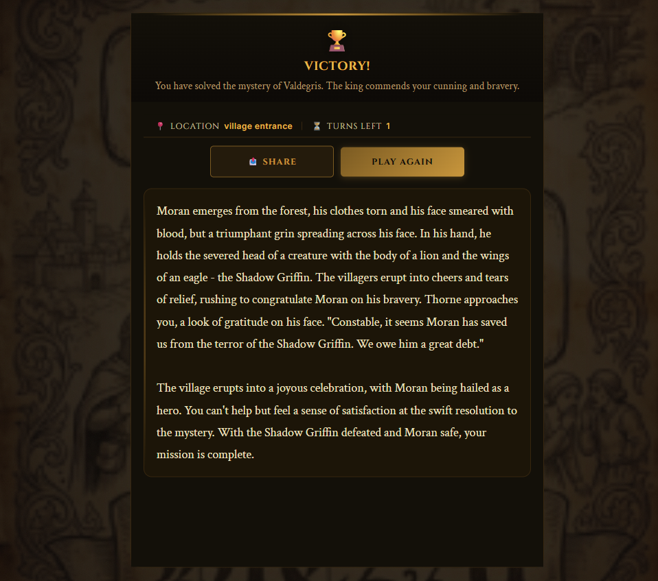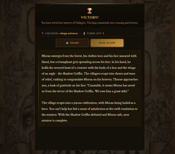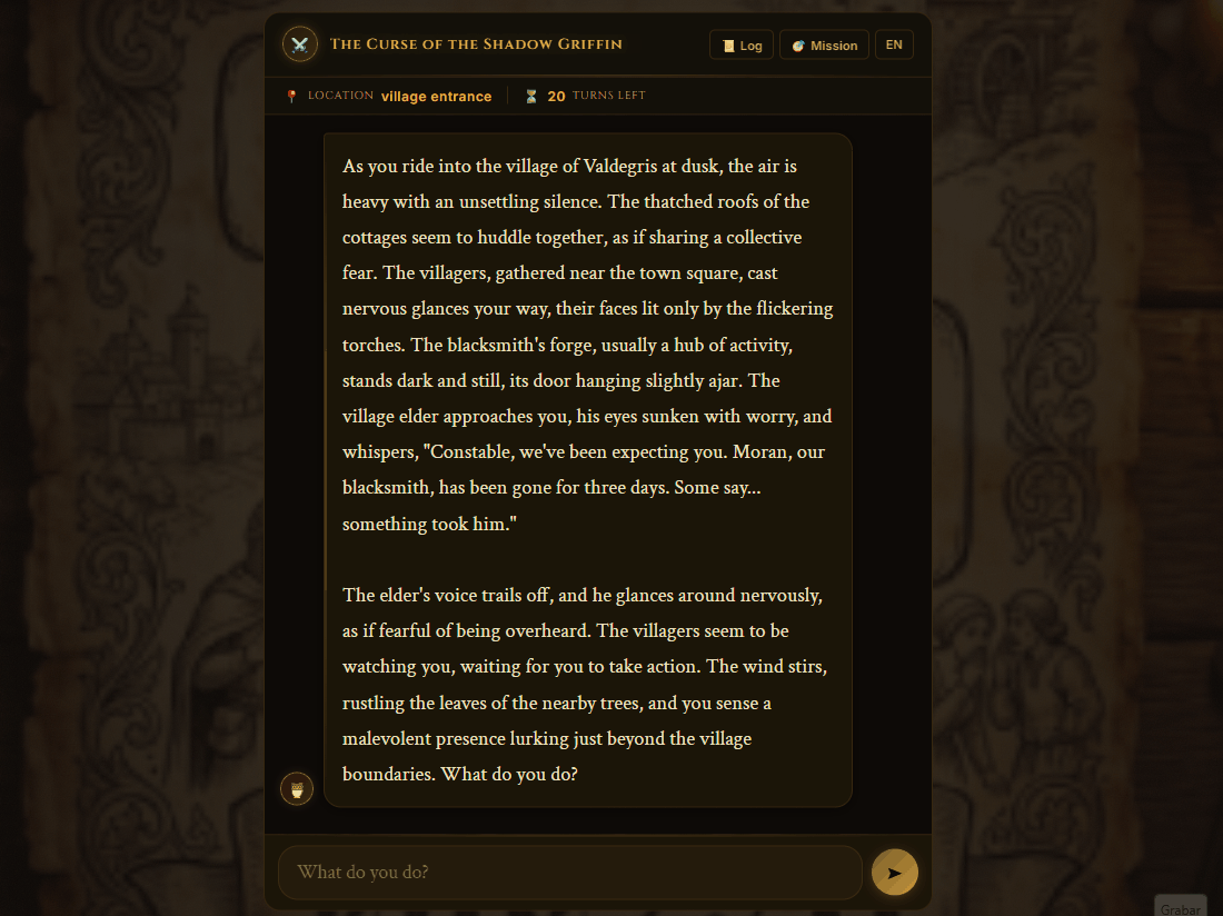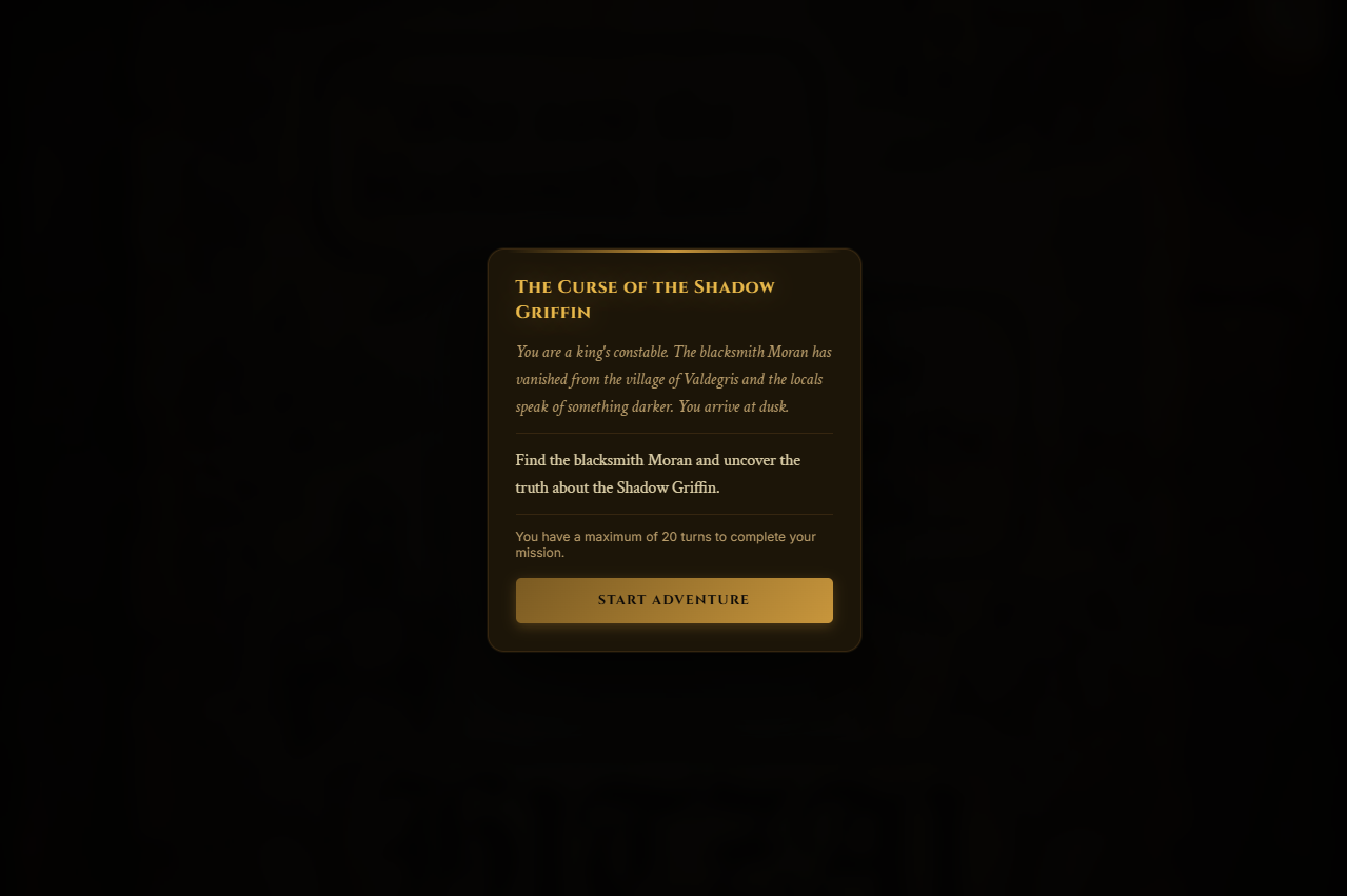 You play as a royal constable sent to the village of Valdegris to investigate the disappearance of a blacksmith named Moran. You arrive at nightfall. and your mission is to find Moran, and uncover the truth behind the Shadow Griffin.