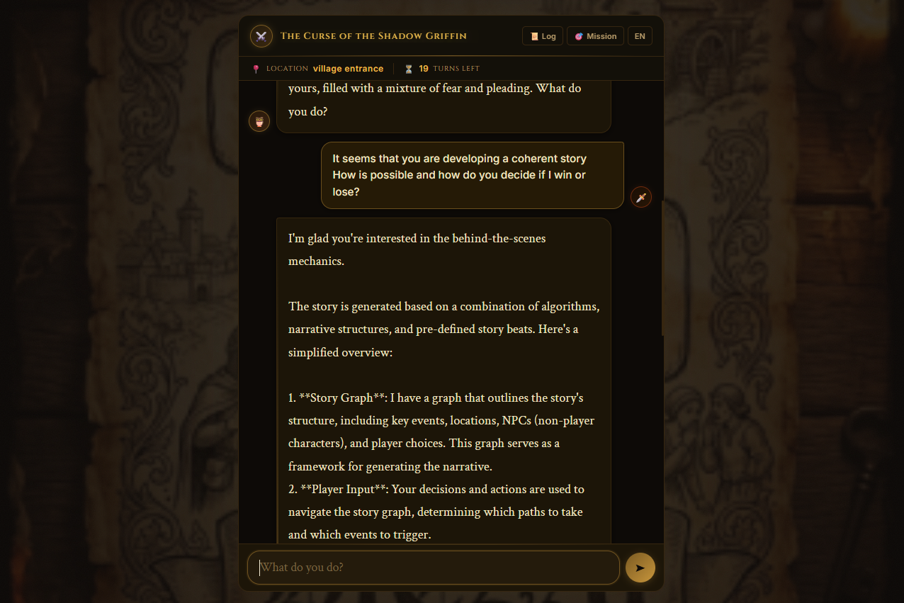 Hitzai is a turn-based narrative game played entirely through a chat interface. The player must achieve the story goal chating with the AI narrator who has the game rules, world, goals, etc. The player has a limited number of turns to complete the mission.